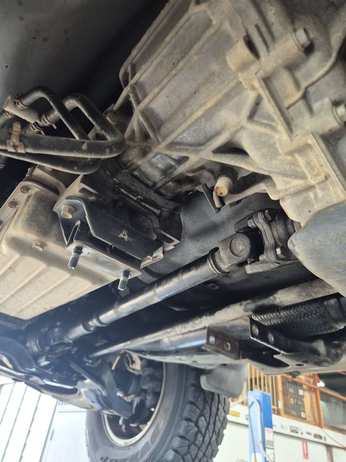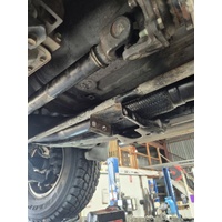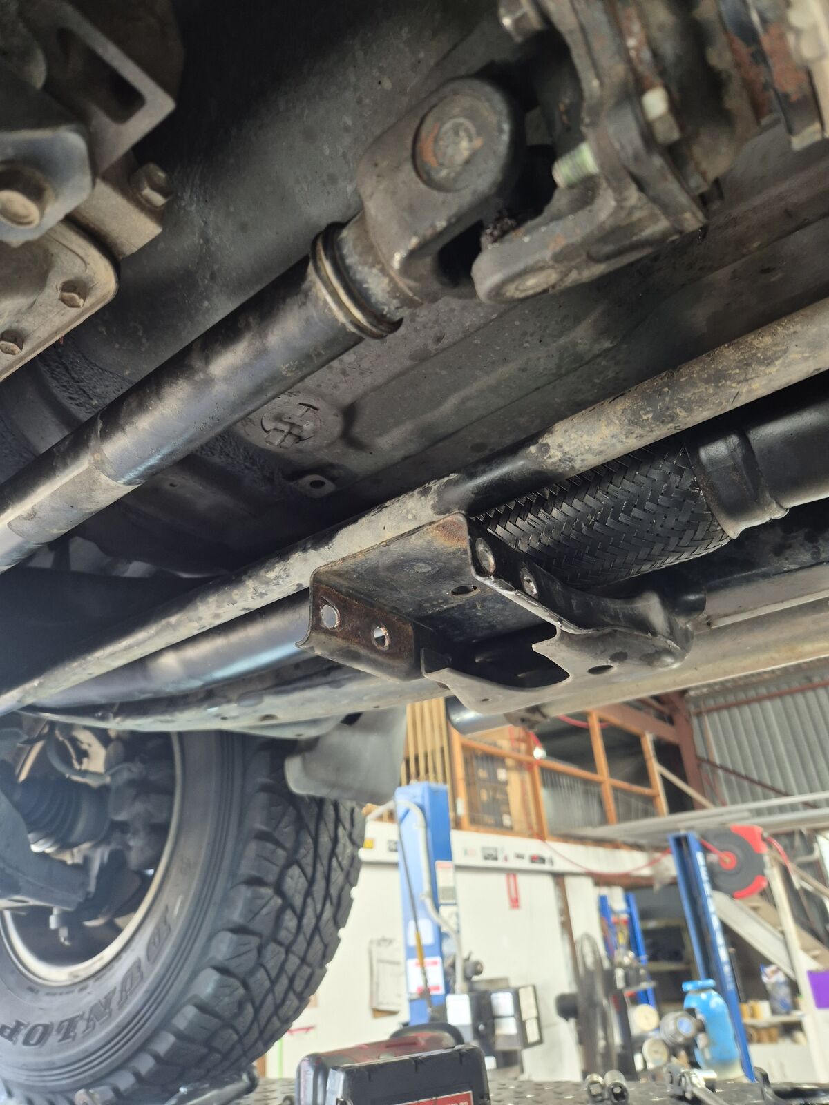 Some automatic models may need driveshaft removed and gearbox crossmember removed with gearbox supported under suitable stand, to fit lower part of dump pipe (refer to last few images) . Spacing gearbox over with suitable block of timber once tailshaft and gearbox crossmenmber have been removed will allow space to get dump pipe past Automatic trans line which otherwise obstruct install