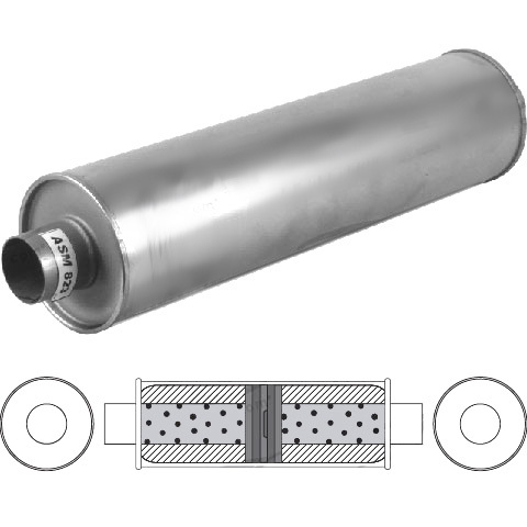 Universal Truck Muffler - 150mm(6") Round, 600mm(24") Long, Internal diameter 075mm(3"), Centre Centre, Open Chambered Baffled, Glass Packed, Aluminised Steel