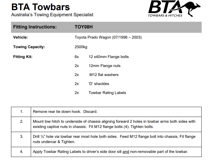 BTA manufacture high qaulity towbars in Australia, we take safety and quality seriously. In Australia, towbars must meet strict standards and regulations to ensure they are compatible with vehicles and guarantee a safe towing experience. The primary standard governing towbar manufacturing is the Australian Design Rule 62/02 (ADR 62/02), part of the Australian Design Rules (ADRs) dedicated to vehicle safety and emissions.Our towbars meet the key requirements outlined in ADR 62/02, including load capacity, mounting points, tongue design, electrical connections, labeling, and compliance markings. Each towbar is designed and manufactured to handle specific loads based on the vehicle's Gross Trailer Mass (GTM) and the towbar's class rating. Rest assured, our towbars undergo rigorous testing to ensure they meet the highest standards of safety and performance before they are available for sale. We label each towbar with relevant information, including our manufacturer's name, towbar rating, and compliance markings, making it easy for you to identify the specifications.